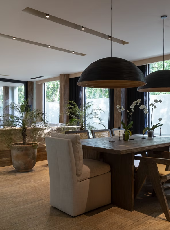 La iluminación indirecta desempeña un papel protagónico, envolviendo los espacios con una luz cálida que acentúa los materiales y aporta profundidad y confort.